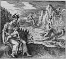 Am unteren Bildrand ist ein Rennen zwischen Hippomenes und seiner Gattin, der Jägerin Atalanta, der Tochter von Iasus und Klymene, die oft mit Artemis selbst verglichen wurde, abgebildet, die einen Apfel aufsammelt.