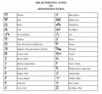 [[Datei:Alchemistische-zeichen.jpg|200px|thumb|left| Erläuterungstafel der alchemistischen Zeichen]] | [[Datei:Alchemistische-zeichen.jpg|200px|thumb|left| Erläuterungstafel der alchemistischen Zeichen]] | ||