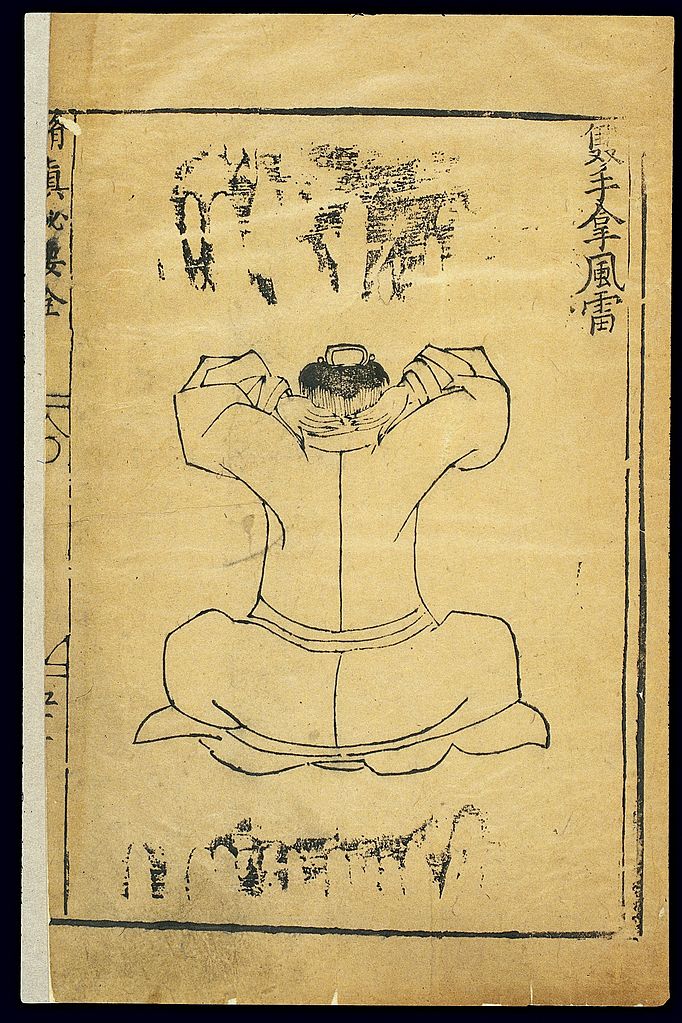 | 17:00, 6. Apr. 2023 | Qigong exercise to treat headache with mental confusion Wellcome L0038920.jpg (Datei) | 193 KB | https://commons.wikimedia.org/wiki/File:Qigong_exercise_to_treat_headache_with_mental_confusion_Wellcome_L0038920.jpg Qigong exercise to treat headache with mental confusion Description Xiuzhen miyao, a gymnastic (daoyin/qigong) text of unknown origin, was rediscovered and published with a preface by Wang Zai in 1513 (8th year of the Zhengde reign period of the Ming dynasty). It records 49 exercises. This illustration depictsShuangshou na feng lei(Holding the wind and thunder in both han… | 1 | |
