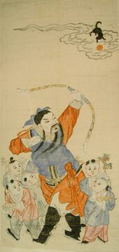 | 15:51, 8. Apr. 2023 | Zhangxian.jpg (Datei) | 220 KB | https://commons.wikimedia.org/wiki/File:Zhangxian02.jpg This painting depicts Zhang the Immortal shooting a pebble bow at a heavenly dog. Because of the painting's association with the story of Lady Flower Stamen, a concubine of the first Song Emperor Tai Zu, it is often interpreted as a metaphor for fertility. Date Late Qing dynasty (around end of 19th century) Source "The New Year Painting of Zhang Xian" Dort : This work is in the public domain in its country of origin and other cou… | 1 | |
