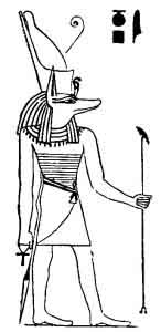 Anubis trägt zumeist ein Was-Zepter und ein Anch. Auf manchen Abbildungen hat er einen Widderkopf. Seine Kult-Hauptzentren waren Heliopolis(Khmunu : Stadt der acht; Ogdoad) und Cynopolis(Stadt der Hunde).