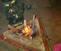 Ein Kunda - Feuertopf wird vorbereitet, und Feuer aus dem Haus eines Brahmanen wird begleitet von einem Mantra in den Topf gegeben. Dem Feuer wird mit dem Mantra 'Vang vahni-chaitanyaya namah' Bewusstsein eingegeben und es dann gegrüsst.