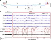 16:31, 14. Feb. 2026 Interactive dreaming (USA group).jpg (Datei) 151 KB https://ar.wikipedia.org/wiki/%D9%85%D9%84%D9%81:Interactive_dreaming_(USA_group).jpg Hypnogram showing that REM sleep began 68 min after sleep onset. The auditory cue to induce lucidity was presented two times (blue arrow), followed by a microarousal and then a longer REM period with lucidity signals (LRLRLR) given six times starting at 69 min. (B) The left panel shows a 5 s period of wake, corresponding to the gray arrow on the hypnogram. The right panel shows a 30 s REM segment, in which… 1