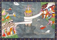 , der auf den Grund des Ozeans zu sinken begann. Daher nahm Vishnu die Form des Schildkrötenavatars an, dessen untere Hälfte ein Schildkrötenpanzer war, und tauchte auf den Grund, wo sein Rücken eine Achse für den buttrigen Stock wurde. | , der auf den Grund des Ozeans zu sinken begann. Daher nahm [[Vishnu]] die Form des Schildkrötenavatars an, dessen untere Hälfte ein Schildkrötenpanzer war, und tauchte auf den Grund, wo sein Rücken eine Achse für den buttrigen Stock wurde. | ||
