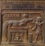 [[Datei:Egyptian Chest with Writing Walters 61271 Detail.jpg|180px|thumb|right| Sobek mit Sonnenscheibe ]] | |||