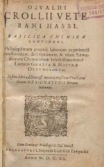 - Osvaldi Crollii ... basilica chymica : continens philosophicam propria laborum experientia confirmatam descriptionem & usum remediorum chymicorum selectissimorum e lumnine gratiae & naturae desumptorum ; in fine libri additus est autoris eiusdem tractatus novus de signaturis rerum internis, Croll, Oswald [1580-1609] Search Wikipedia for Oswald Croll, Imprint Francofurti : impensis Godefridi Tampachii, 1620