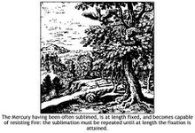 7 : Der oft sublimierte Mercur ist endlich fixiert und wird fähig dem Feuer zu widerstehen - die Sublimation muss wiederholt werden, bis endlich die Fixation erreicht wird