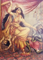 Zur Linken von Bagala ist der eingesichtige Maharudra, der das Universum auflöst. Der Kranich - Vogel wird als das Wesen der Täuschung angesehen.