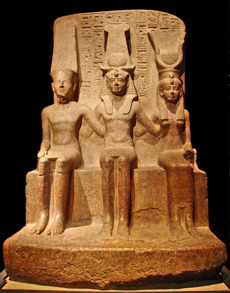 Le Roi Ramses II (1279-1213 avant J.C.) avec le Dieu Amon et le Dieu Mut, granite rouge, temple d'Amon, Thèbes