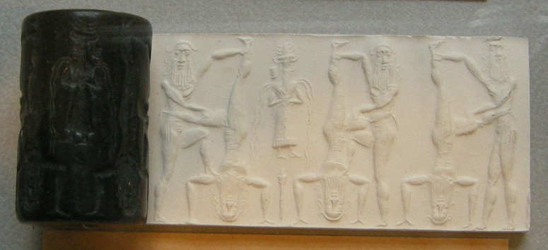 Datei:Sigillo a cilindro assiro gruppo di eroi davanti al dio enki.jpg