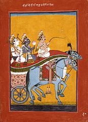 Krishna und Balarama werden von Krishnas Onkel und Verehrer Akrura auf Einladung Kamsas nach Mathura gefahren