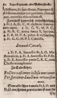 Die Bruderschaft des R.C. stellt sich vor. Der gnädige Gott habe soviel Gnade und Güte ausgegossen, daß hocherleuchte Ingenia aufstehen können, die zum Teil die verunreinigte unvollkommene Kunst wieder zu recht brächten, damit doch endlich der Mensch seinen Adel vnd Herrlichkeit verstünde, welcher Gestalt der Microcosmus sei, und wie weit sich seine Kunst in der Natur erstrecket....