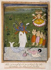 Laut dem Matsya-Purana und dem Bhagavata-Purana rettete Vishnu in seiner Fisch-Inkarnation den Weisen Manu in einer Arche vor der Sintflut. Er bewahrte dadurch die Welt vor dem Untergang und rettete die Veden für Brahma.