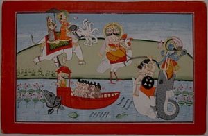 - Matsya sagt die Sintflut voraus, und Satyavrata Manu flieht mit den Seinen, vielen Lebewesen und mit Saatgut in ein Schiff.