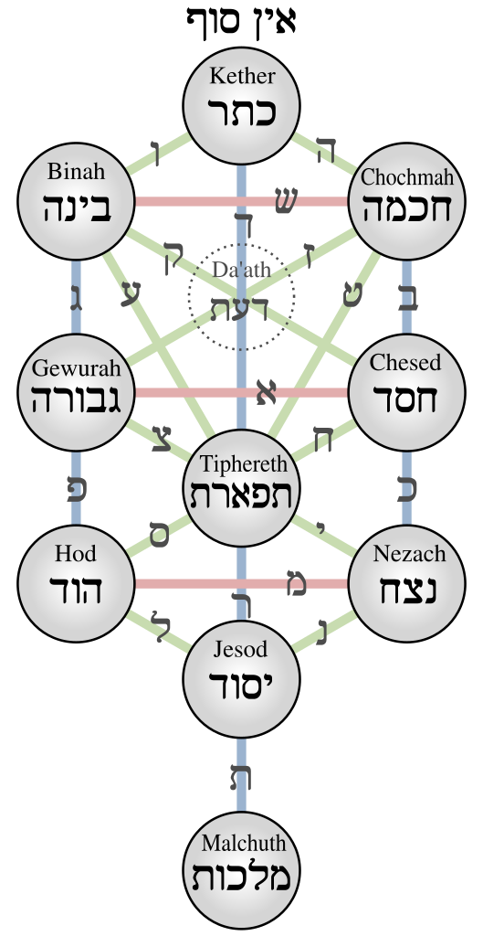 14:50, 27. Aug. 2024 Kabbalistic Tree of Life (Sephiroth) 2.png (Datei) 144 KB Adm1 https://commons.wikimedia.org/wiki/File:Kabbalistic_Tree_of_Life_(Sephiroth)_2.svg dort : Tree of life with the 10 Sephiroth and the 22 Hebrew characters as they are presented in the Sefer Yetzirah (Book of Formation). The different colors of the lines represent the three groups of characters: red the 3 "mother" letters blue the 7 "double" letters green the 12 "simple" letters Date 25 December 2014 Source Own work -- an equivalent graphic to File:Tree of Life (Sephiroth).svg wit… 1