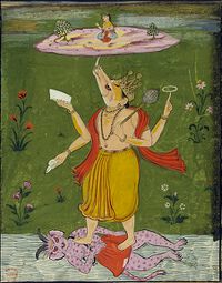 Varaha-Avtar tötet einen Dämon um die Erde(Prithivi) bzw. die Erdgöttin Bhu Devi zu schützen, welche er auf seinen Stoßzähnen über das schwarze Meer(samsara) hebt