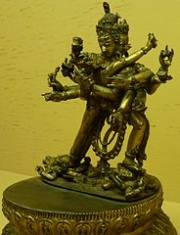 Yab-Yum(Tibet. Vater - Mutter; Gefährtin : Skrt. Praja, Tib. Yum) ist eine besonders aus dem tantrischen Buddhismus bekannte Darstellung der Vereinigung einer männlichen und einer weiblichen Gottheit. Man beachte aber die vielen rituellen Gegenstände in den Händen der Partner.